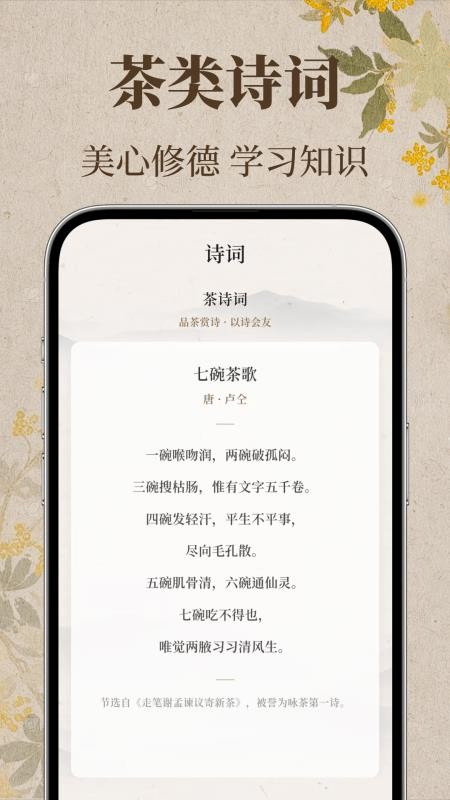 收录了许多有关茶叶的诗词内容,你可以通过软件了解更多的茶叶诗词;