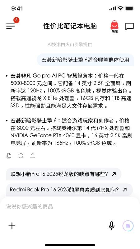 与软件的AI进行交互,让AI根据你的购物需求推荐合适的商品;