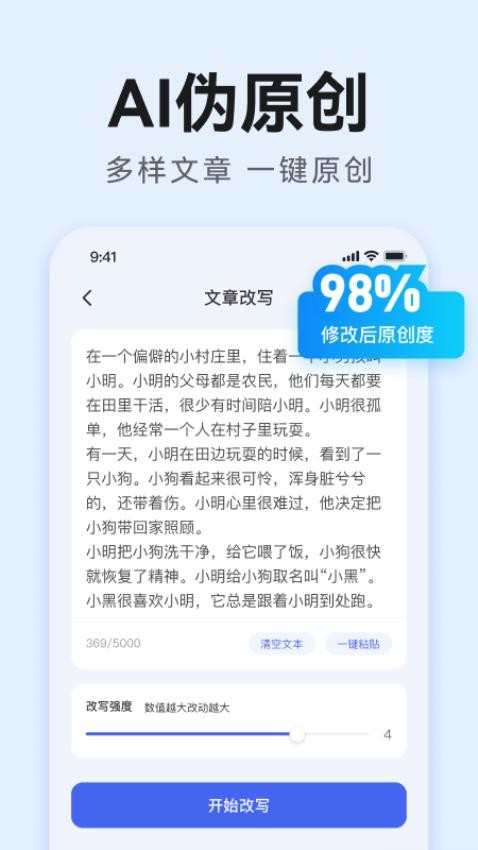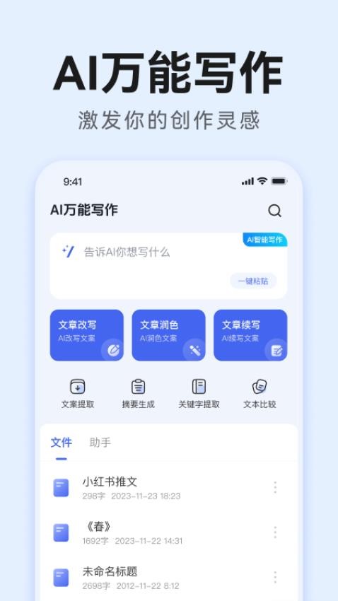 AI万能写作最新版是一款功能强大的AI智能写作软件。这款软件具有十分先进的人工智能写作极速,可以为用户写作文、写论文、写公文以及视频脚本等各样内容提供很多的帮助,是一个非常优质的写作助手;而且软件里面还为用户们提供了多样优质的文本优化功能,用户可以随时将自己的原创文章上传到软件上,使用软件快速优化文章,提升文章的质量,轻松实现伪原创。此外,AI万能写作APP官方版里面还提供了文字游戏以及多领域测试题,用户可随时体验。有需要的用户赶紧在本站下载这款软件体验吧!