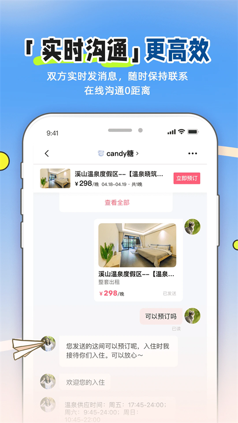 你可随时随地打开小猪 APP,浏览房源照片,挑选自己喜欢的房源,了解房源和房东的介绍及价格信息,并与房东进行在线沟通,*时间掌握这些短租日租房、民宿客栈或是酒店式公寓的详情,轻松完成住宿预订。你还可以从房东那里了解到超正宗的当地文化和旅游信息,完美规划自己的旅程。