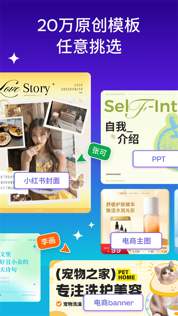 20万+原创模板,小红书图文/海报/简历/封面/Logo/PPT/朋友圈配图/电商主图/节日模板,应有尽有。