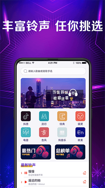 热门歌曲铃声、彩铃(炫铃),每日更新曲库超全,只要你想得到,在这里就能找得到。