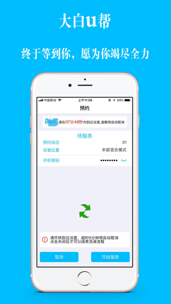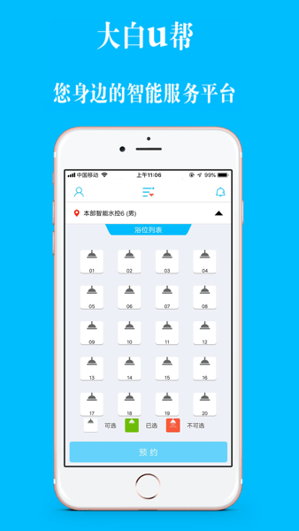 “大白U帮”是一款专门面向大中专院校用户校园服务的手机客户端软件。用户成为注册用户后,即可使用本客户端软件预约可以提供洗澡服务的洗澡间,用户可以自己选定使用服务的时间并通过个人账户的余额进行结算。同时对接了数量庞大的洗澡硬件系统,提供了非常好的人机交互界面和线上功能。