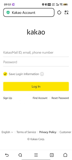 3、输入你的kakao账号和密码,点击登录,完成注册。