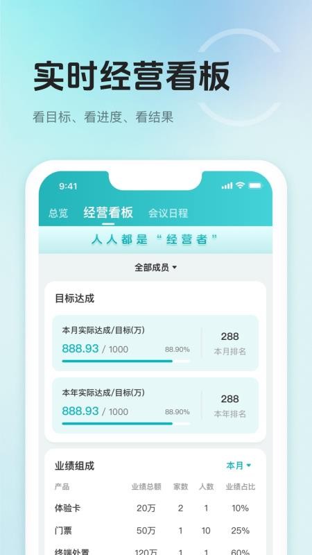 5、阅览经营看板,知道目标达成进度,还能查看业绩组成数据;