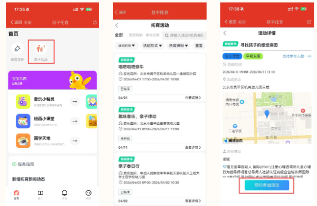 进入首页后点击【亲子活动】图标,即可查看全区所有幼儿园发布的亲子活动列表。选择有意向的活动点击预约,填写幼儿信息即可完成活动预约。