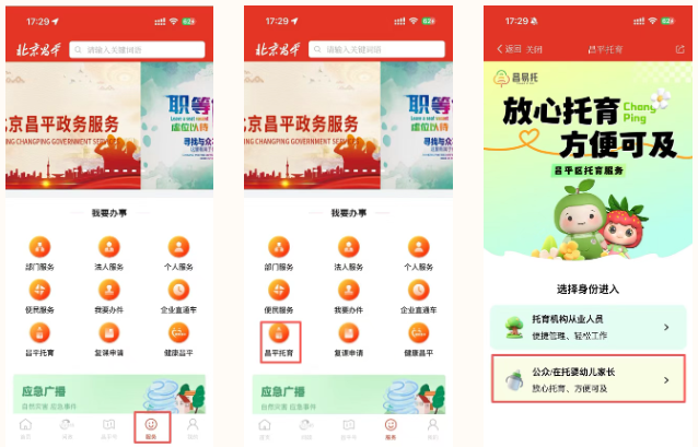 打开北京昌平app,点击APP底部导航【服务】模块。在服务事项列表中找到【昌平托育】,选择【公众/在托婴幼儿家长】进入功能专属首页。