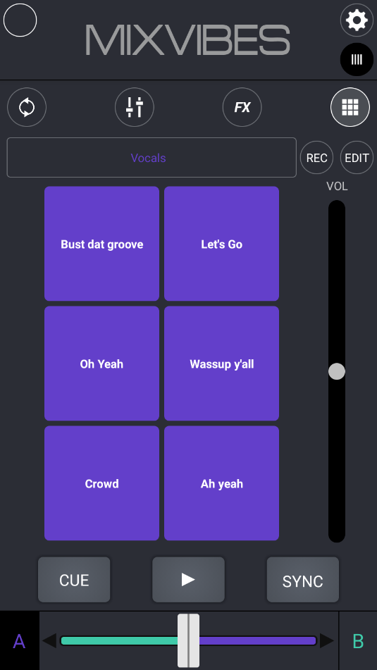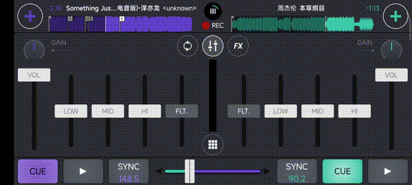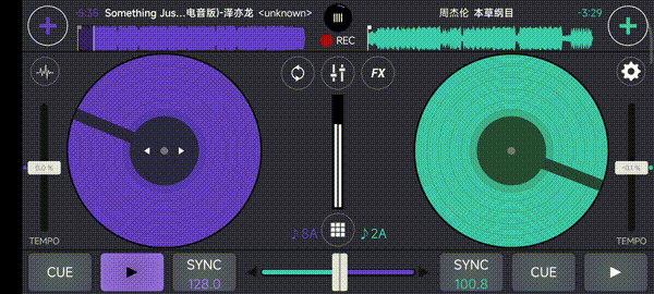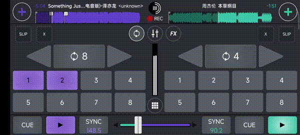 导入音频,点击下播的播放软件可以开始进行打碟啦,左边的颜色条往上拉是慢放、往下拉是倍速播放,cue则是播放点,中间则是左右两个音频的音量占比。