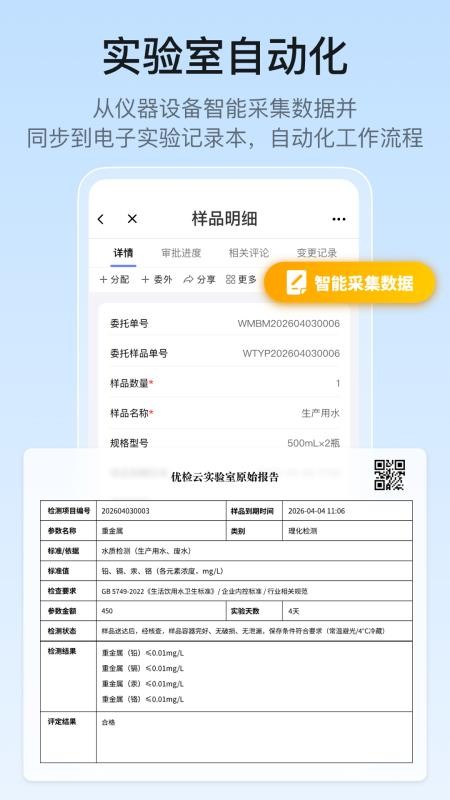 优检云实验室管理官网版app是一款为用户提供智能实验室管理系统软件,软件支持用户对实验室来进行数智化管理,方便用户轻松高效管理,对其可以一站式管理,有效检测任务来进行管理,随时采集、入库样品,轻松管理,简化工作流程,实现自动化的实验采集记录,高效管理。平台还支持用户对采集的数据进行分析,轻松统计分析,有效生成数据报告,就可让你审核签章,查看详细的实验报告数据;此外,优检云实验室管理免费版还支持用户灵活自定义代码,随心新建委托信息,更好的进行提交,有需要的用户就赶紧来本站下载使用吧!