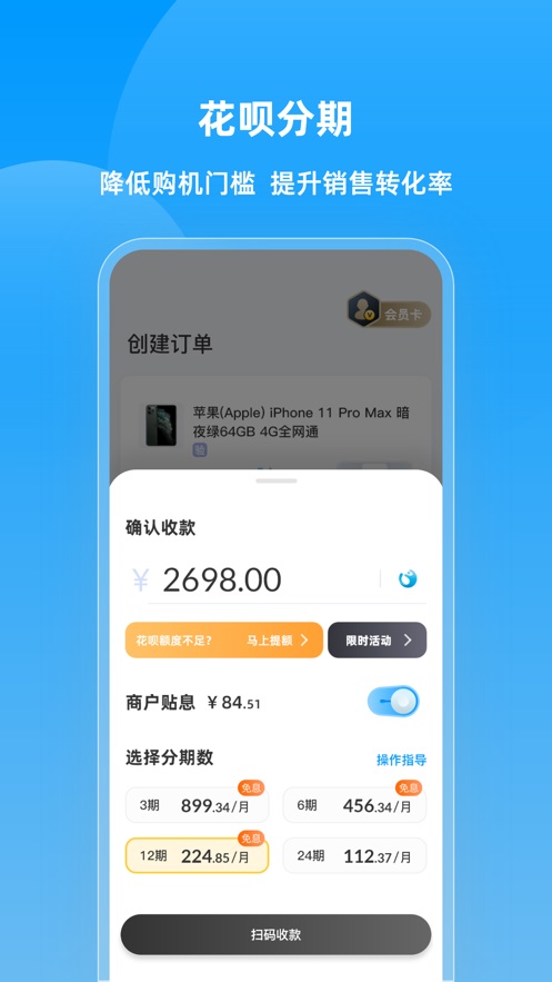 商家在线申请开通快售宝收款,通过扫码即可实现快速分期;用户有花呗就能分期,分期申请无需任何审核,超低的利率领先全行业。