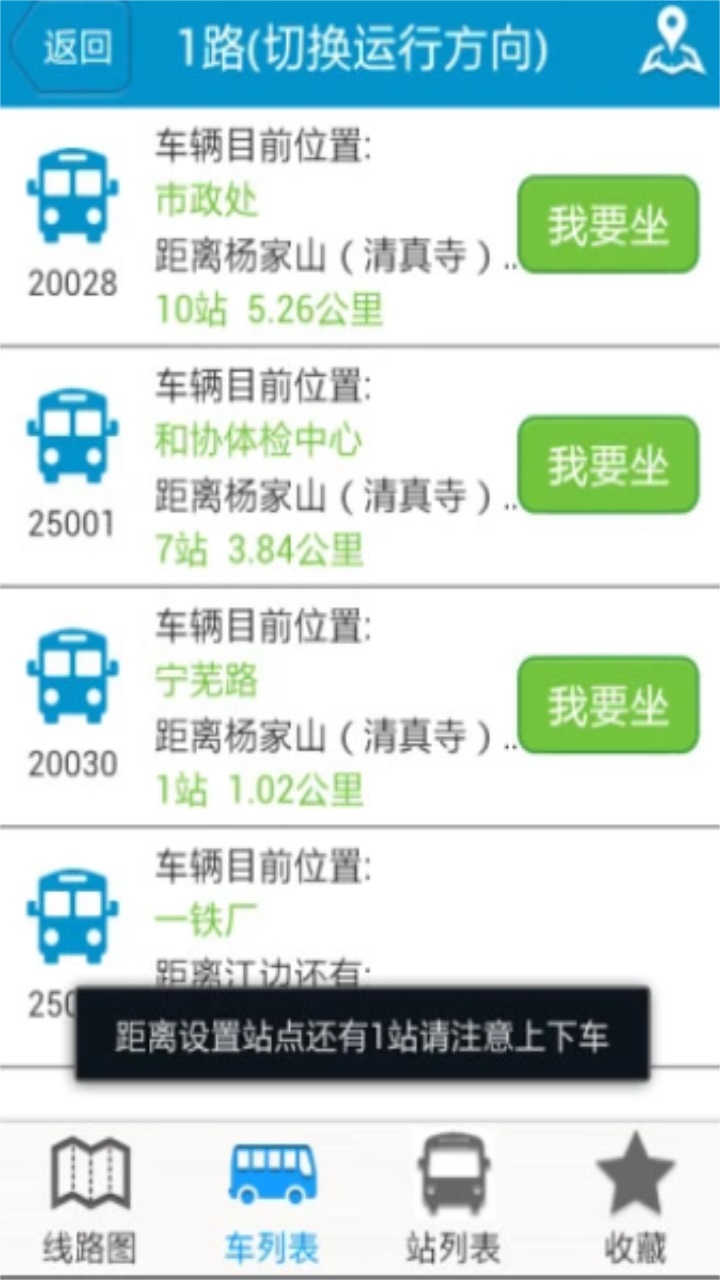 设置需要乘车的站点,公交车经过该站点时,客户端会发起乘车闹铃,提醒乘客及时乘车。