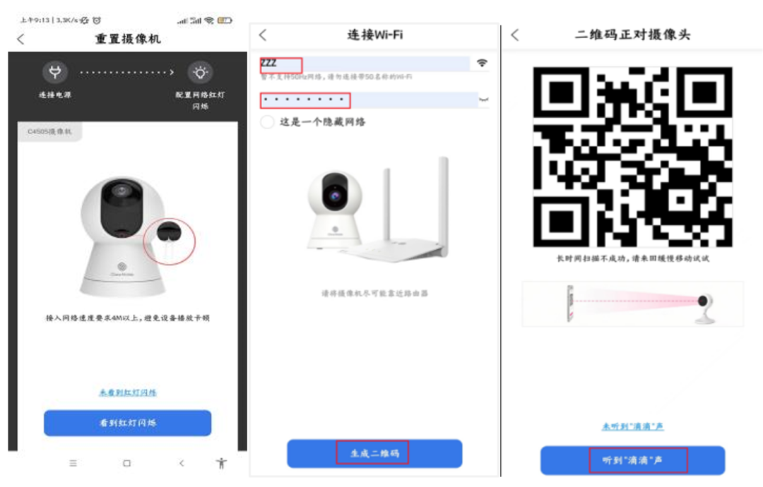 扫描摄像机机身二维码,根据设备指示灯或语音提示进行确认。按照APP提示填写需接入的2.4GHz Wi-Fi信息,点击生成Wi-Fi二维码后,将二维码正对摄像头进行扫码联网(距离:10-30cm,可缓慢移动找到最佳扫码距离)。
