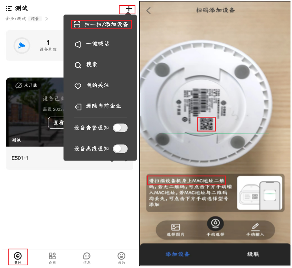 点击右上角“+”,选择“添加设备”,然后扫描摄像机机身二维码,根据设备状态选择继续绑定或重置设备。