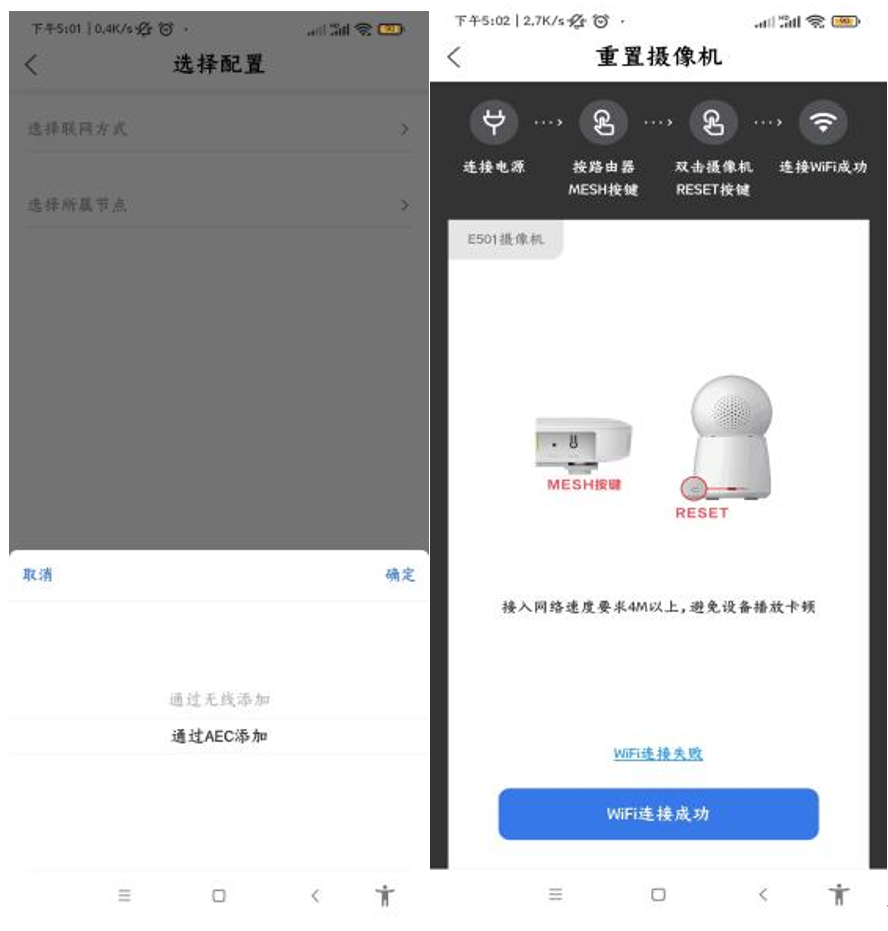 扫描摄像机机身二维码,选择“AEC添加”和绑定节点。再按下路由器“MESH”组网键组网后,双击摄像头机身“RESET”按键,然后根据设备指示灯或语音提示进行确认。
