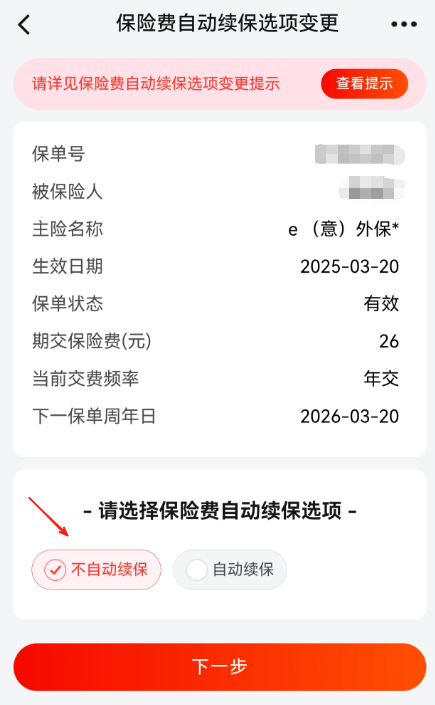 最后,选择不自动续保,然后点下一步,按流程指引,取消自动续费。