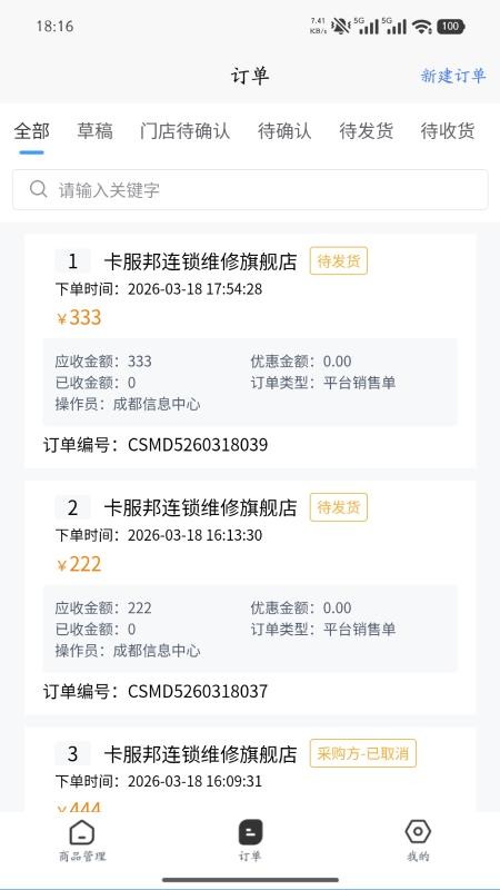 4、进入到订单页面中找到右上角的“新建订单”功能可新建订单在线管理;