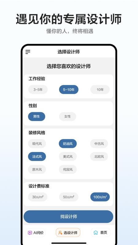 根据自己的需求可自由查找和选择设计师,还能通过筛选经验、风格和性别查找设计师;