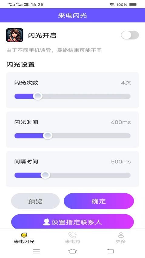 支持用户将来电闪光效果设置给指定的联系人,便于重要电话的提醒使用。