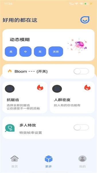 多功能帧率渲染。提供了从日常、图像质量与渲染视频帧率,阴影质量图片、后期效果等多方面的功能,操作简单,即点即用,避免您下载超多应用的难题,且应用体积轻巧,界面简洁。部分功能介绍:(特效质量,帧率),镜头高度自动回正(镜头偏移设置自动矫正),动态模式(设置动态效果与视频质量底中高),BIoom功能(一键自动开启),抗锯齿(TAA不一样的流畅),人群密度(密度显示设置),多人特效(便捷开启所有流动性特效),性能模式(多性能自动调节)