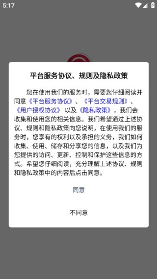 1、阅读平台服务协议及隐私政策,点击同意按钮。