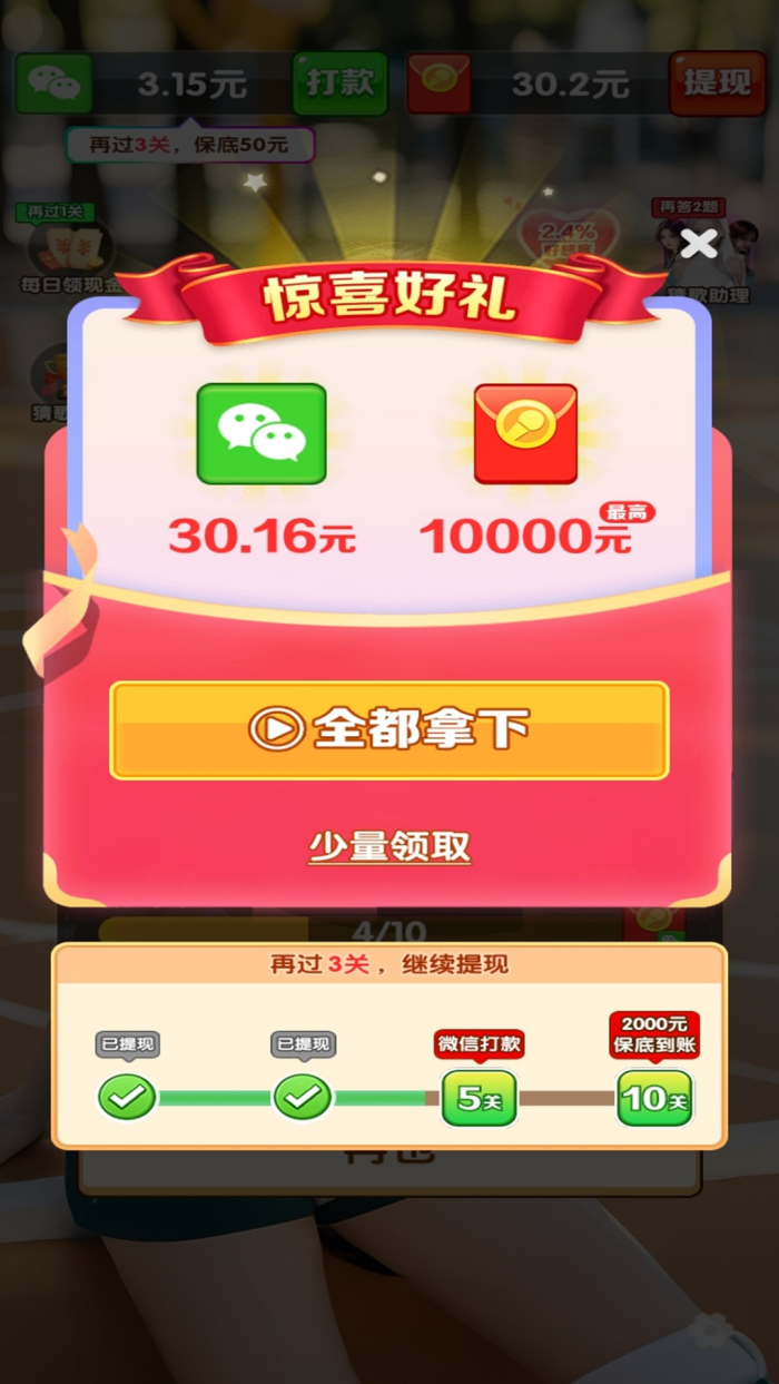 2、答对题目后上面就会积分,达成指定分数即可获得过关奖励。