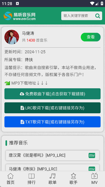用户们可以点击下载按钮,下载自己喜欢歌曲的mp3和歌曲歌词