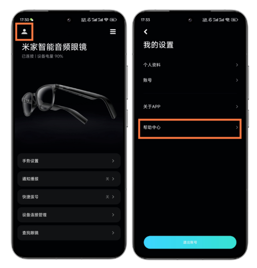 Step2:点击帮助中心,选择你的眼镜之后,点击底部“问题反馈”