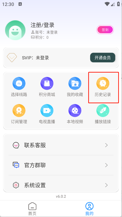 1、在我的页面点击观看历史。