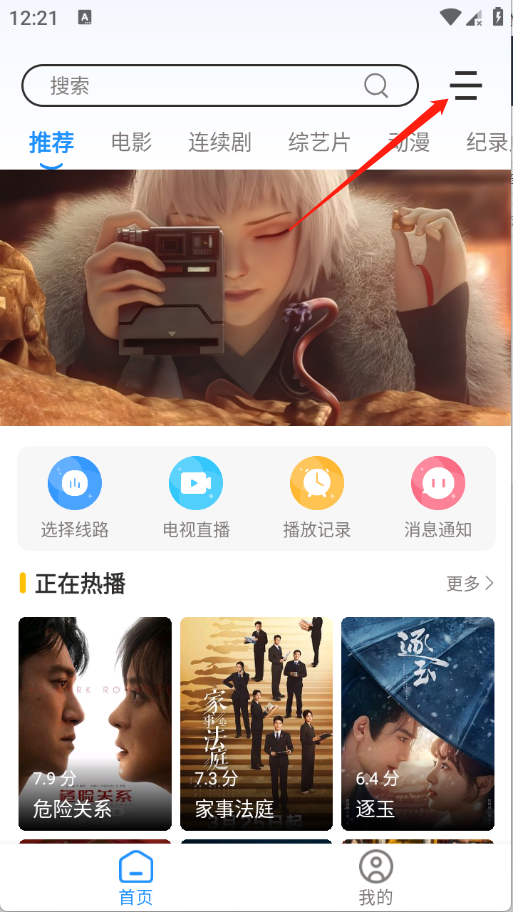 1、在首页点击右上角的箭头指示位置。