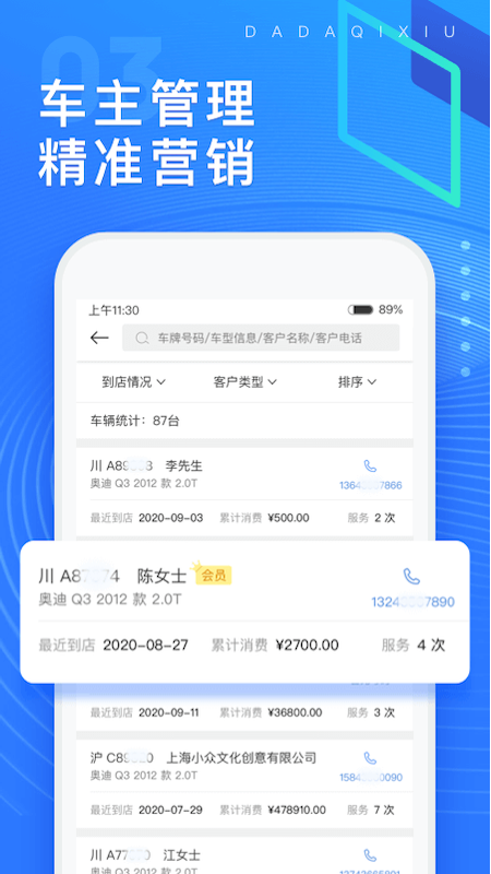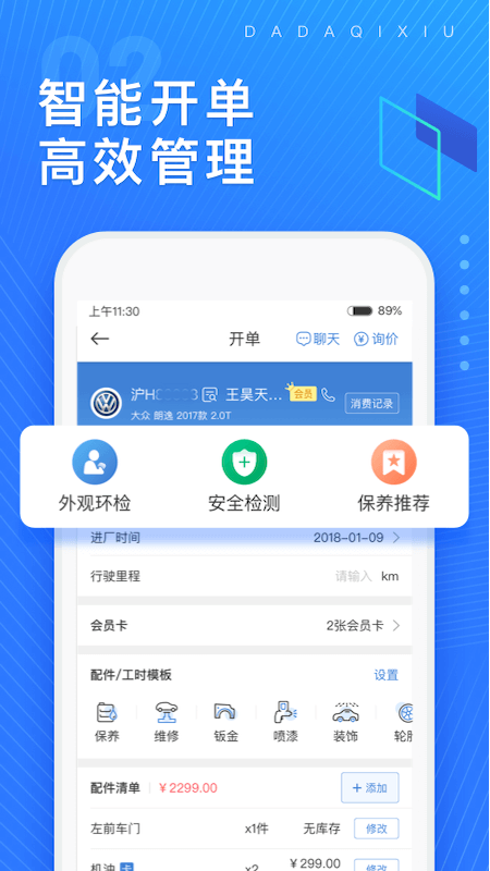 大大汽修是一款面向汽修商店研发的一款车辆维护修理的管控app,是一款可以一条龙服务到底的软件,大大节省资源,一键操作安心又简单,可以一键的结算服务,工资透明化可以一键了解薪资构成,对车的管控也是可以快速搜索到,方便带买家看车。
