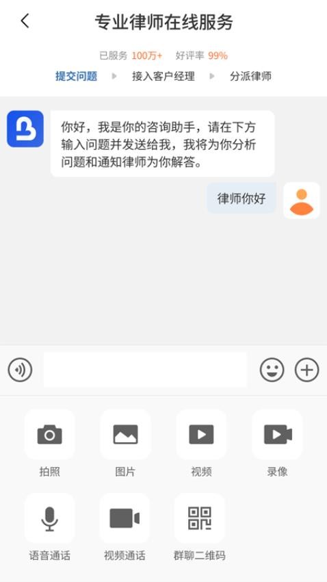 支持文字、语音、视频等多种方式进行法律咨询,用户可任意选择。