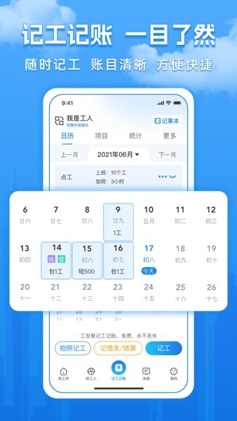 2. 记工记账:为建筑工地的管理提供便捷的考勤、借支、记账、记工信息录入功能。工友们可以方便记录工作时长、借支记录等,数据安全得到保障,帮助管理人员更好地了解工作情况。
