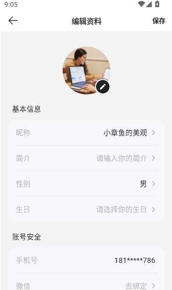 5、到达“编辑资料”菜单界面后,继续点击用户头像进入下一步操作
