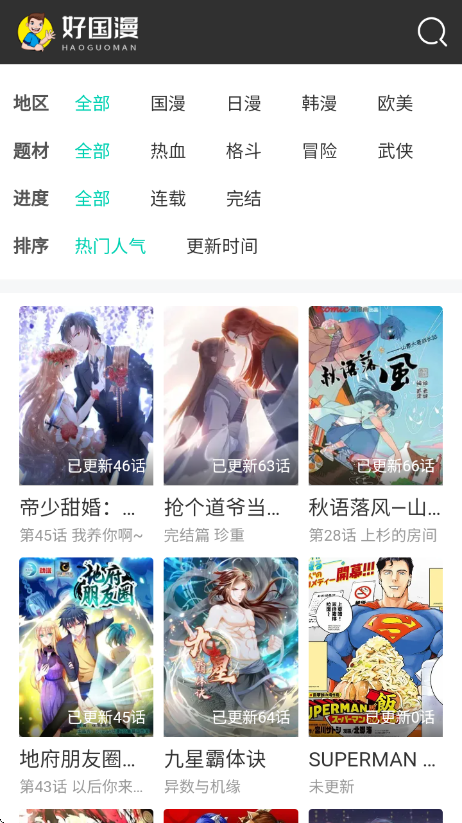 好国漫,按照题材、地区、热度等多种分类方式,方便用户快速找到感兴趣的漫画。支持一键搜索功能,轻松输入关键字,就可以找到感兴趣的漫画作品。各种类型的漫画都在这里,你可以随意选择,离线观看。