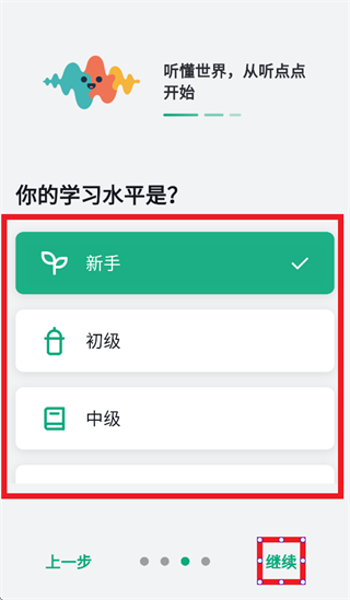 选择学习水平,点击继续