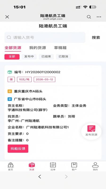 详细的货源信息,知道货主、企业、要求和备注等信息,方便用户提供服务;