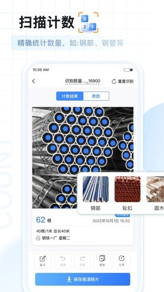 * 智能识别图片中的数量,支持计算钢管、钢筋、方管、盘扣斜杆、轮扣、圆木、方木等;