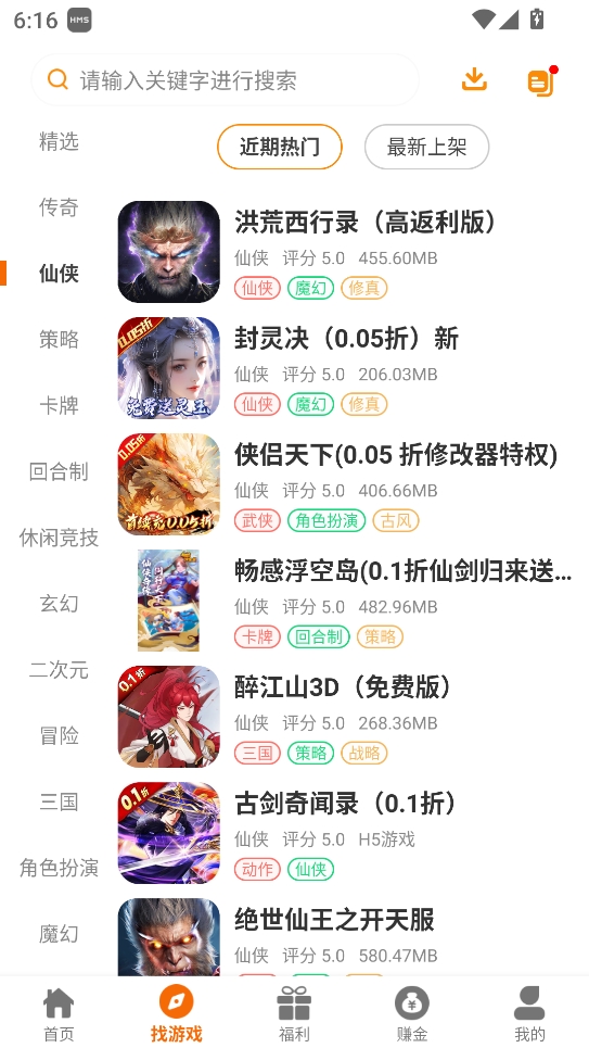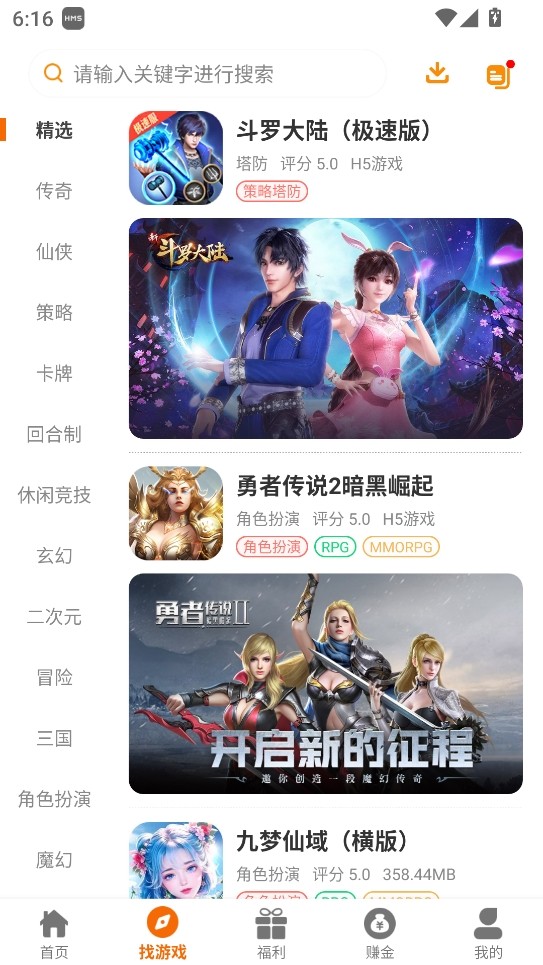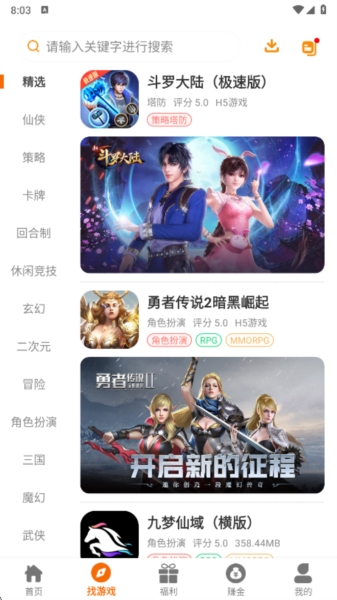 3、“找游戏”栏目,将游戏进行了详细的归类,包含了策略、仙侠以及卡牌等类型。