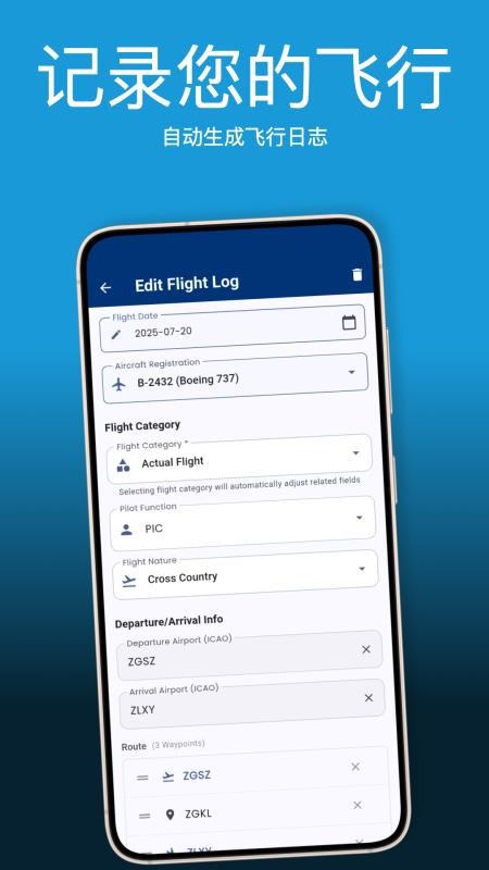 3、详细记录自己的费心轨迹,就可自动生成飞行日志。