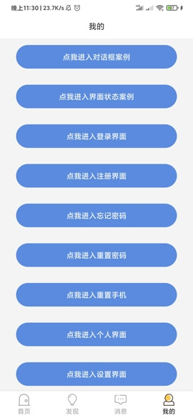 3、切换至“我的”个人中心,依次点击进入对话框、界面状态、登录注册等案例页面;涵盖密码重置、手机绑定、个人设置等功能入口,帮助用户快速定位账户管理与安全配置相关操作路径。