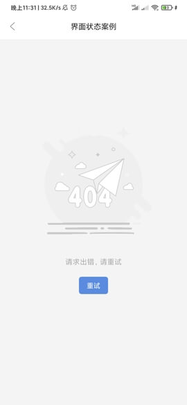 4、访问“界面状态案例”时显示404错误页,含纸飞机插画与“请求出错,请重试”提示;点击蓝色“重试”按钮可刷新页面或返回上一级,用于测试异常状态下的用户引导与容错机制表现效果。