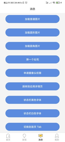 2、在“消息”页面点击多个功能按钮,如加载图片类型、弹出吐司提示、申请摄像头权限;下方提供跳转详情页、状态栏字体颜色切换及Tab页导航,全面演示交互反馈与系统权限调用流程。