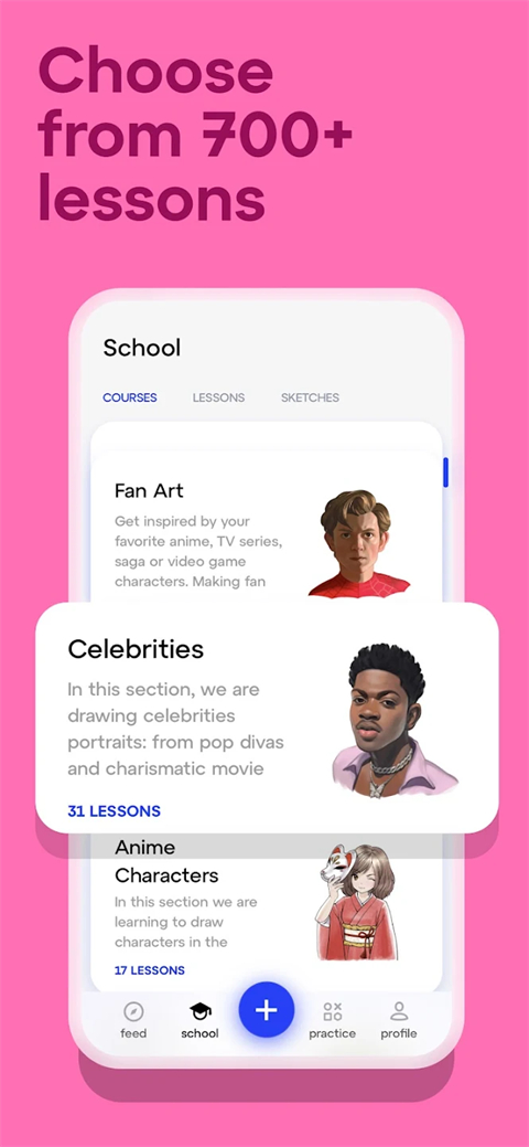 您可以在各种分步绘画课程中选择您最喜欢的课程。您可以从初学者课程开始,或者深入学习一个特定的主题来提高您的绘画技能,比如学习绘画肖像或动漫。你还可以学习绘画动物、漫画、涂鸦,还有很多其他很酷的东西。