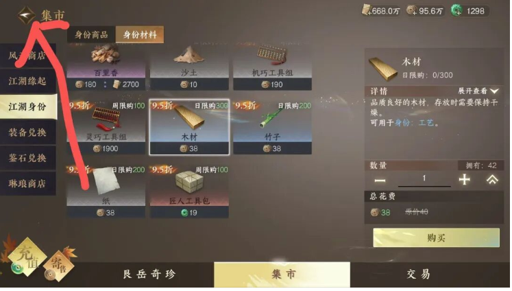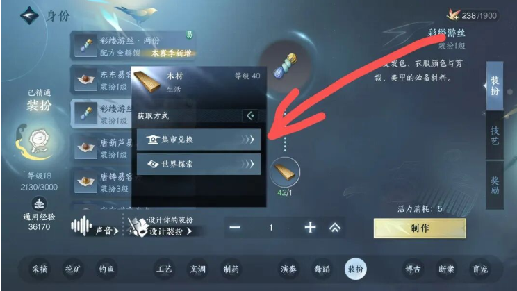 第二步:跳转到身份页面后,点击用木材做彩缕游丝的那栏,点击木材【获取方式】,然后选择集市兑换跳转到集市界面。