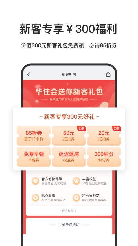 第一时间获知华住最新优惠信息和市场推广活动信息;查看和使用官方渠道独享的积分、红包、优惠券、储值支付服务。