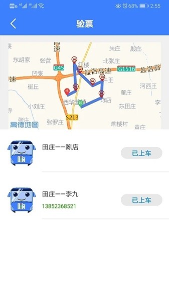 根据后台推送的乘客信息,司机可对乘客进行“验票”操作;乘客需提供自己的订单信息或手机号信息,司机核实信息后点击“未上车”按钮,按钮由未上车状态改为已上车状态,完成验票操作,乘客订单状态由“未使用”变成“已使用”。