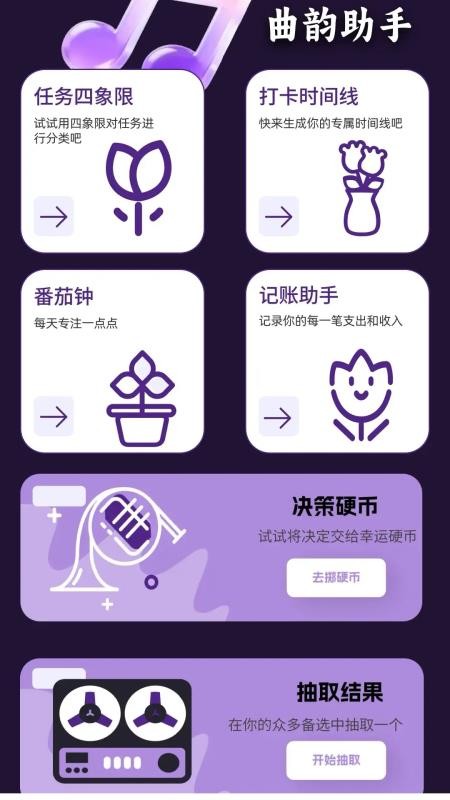 曲韵猜猜APP不仅仅能满足用户练习唱歌和学习乐器知识的需求,还能使用诸多工具管理自己的生活事项,同时可以通过硬币做决策,一站式满足用户在各个场景下的需求,享受贴心服务;简单易用的多功能音乐软件,解决用户诸多难题,无需安装多个应用,快来试试吧!