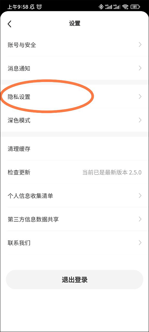进入设置界面我可以看见许多有利于我们使用这款软件的设置,比如在夜间使用对眼睛比较友好的深色模式,以及对自己账号进行设置的账号与安全,这个时候就到了我们今天的主题,点击隐私设置就可以进入隐私设置界面了。