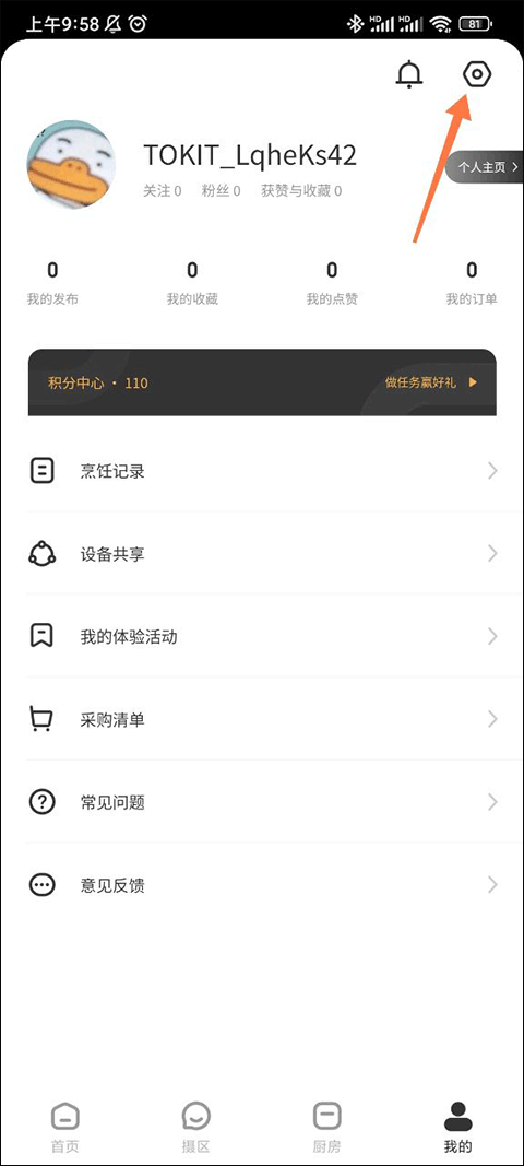 首先我们进入TOKITapp,点击底部的”我的“进入个人主页,在这个页面我们可以看见许许多多的有关于我们自己的功能,例如我的发布、我的收藏、我的点赞这些,但今天我们的主题不是这些功能,就先略过它们,点击右上角小铃铛图标旁边的小齿轮图标,这样我们就能进入设置界面了。