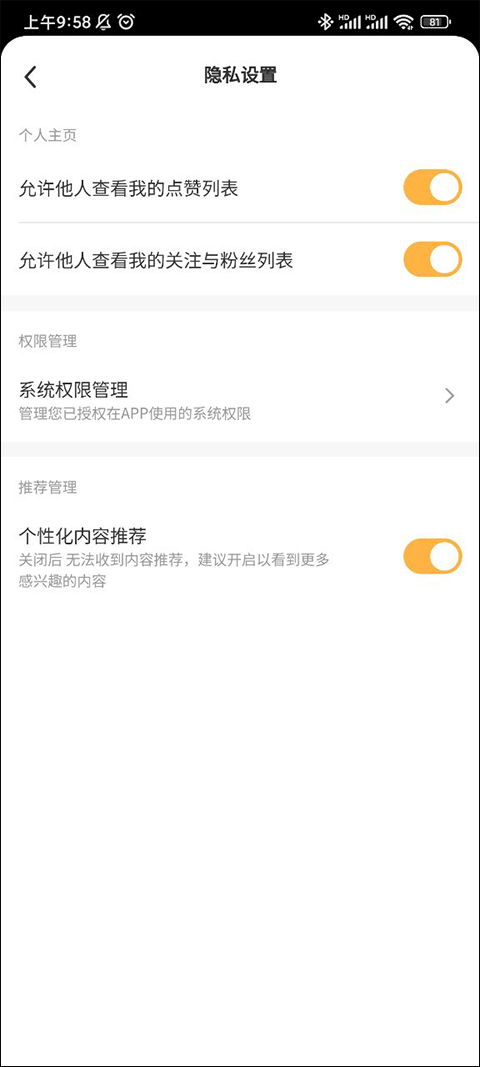 进入隐私设置界面映入眼帘的就是对个人主页的设置了,我们可以对他人查看自己的点赞列表和查看自己的关注与粉丝列表进行设置,可以设置不允许保证自己的隐私,非常的方便,其次我们还可以设置不允许软件推送个性化内容推荐,当然,如果关闭这个功能后,我们将无法收到内容推荐,小编这边还是建议大家开启这个功能的,毕竟软件推送的都是让大家感兴趣的东西。